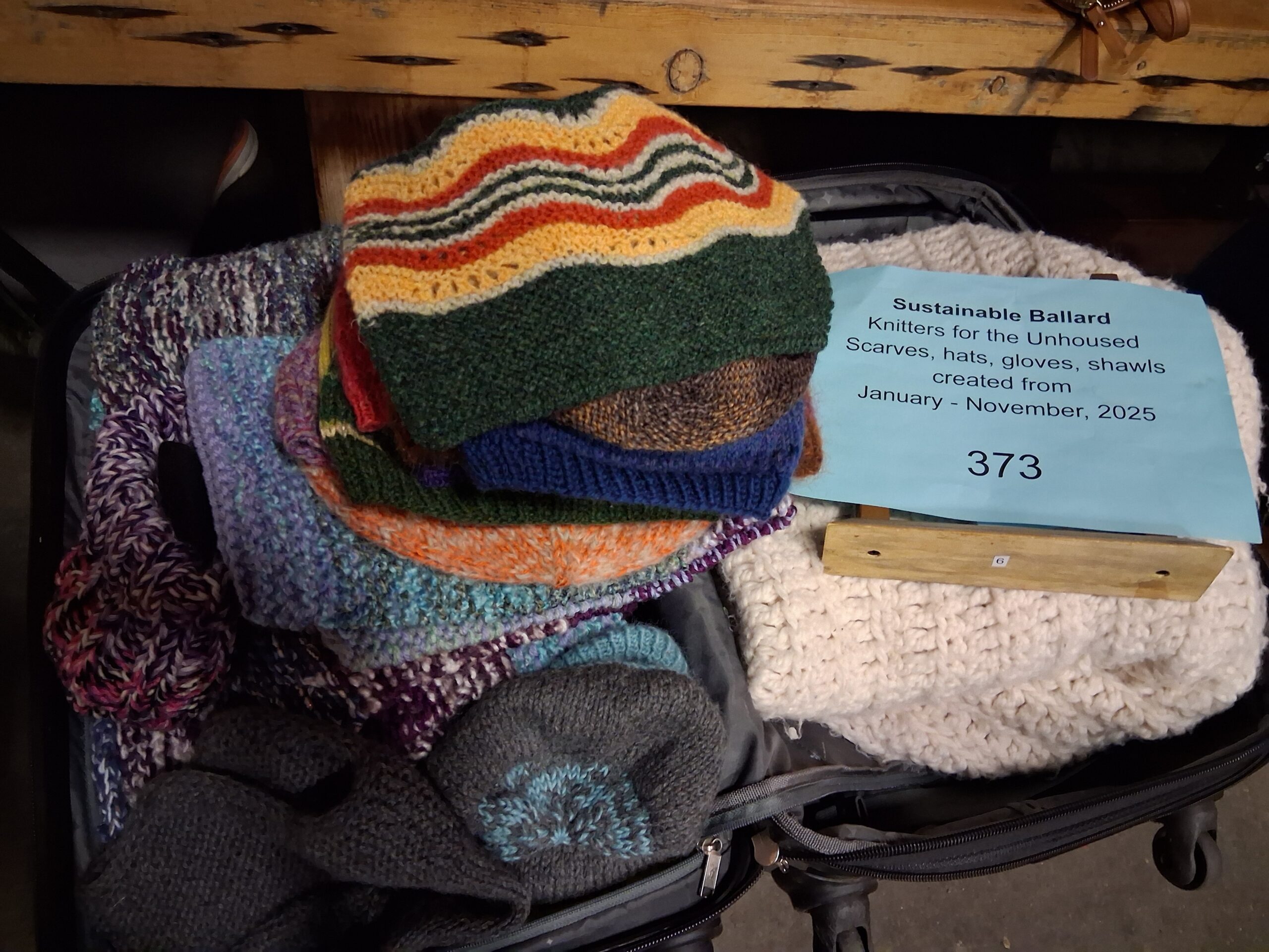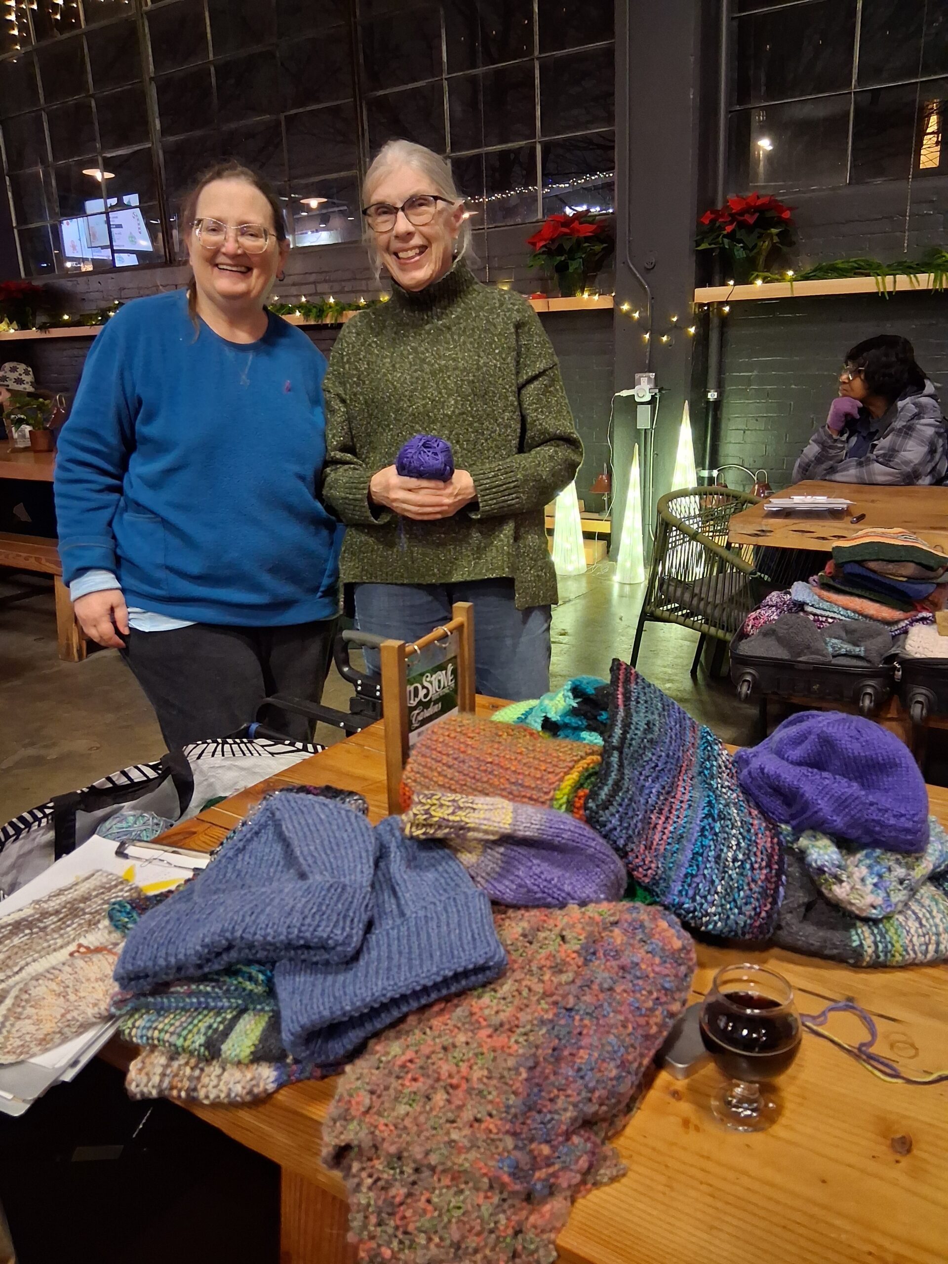 SBKnitters started the last session with 373 knit goods. As our last 2nd Tuesday of 2025 evening wore on, folks who knit with us every monthly gathering and folks who knit at home and drop off at our gathering, continued to bring more warm items. We don’t have a final count for 2025, but it looks like we may cross the 400 item mark!