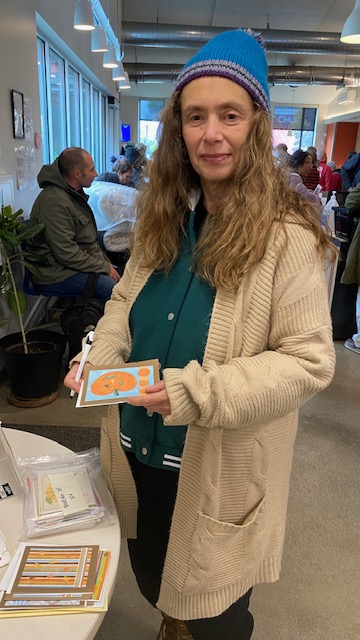 Our Free Letters Home project at the Ballard Food Bank continues to grow in popularity with very appreciative clients. Weekly we give out dozens of cards and stamps to clients, so a continuous supply of cards and postage is really appreciated. Both these people pictured below were happy to select a card from SB supply and then write a message on the card, apply a stamp from us and mail the card right there at the BFB mail service nook.