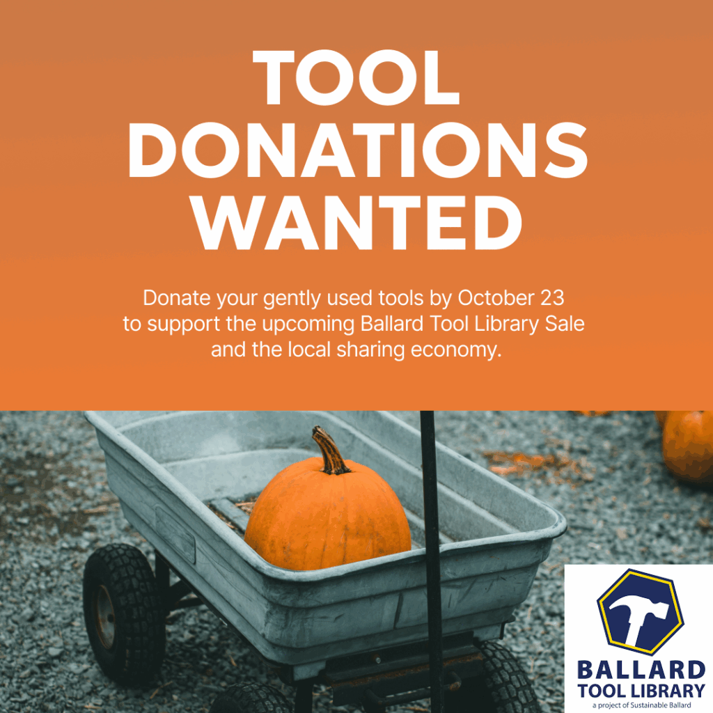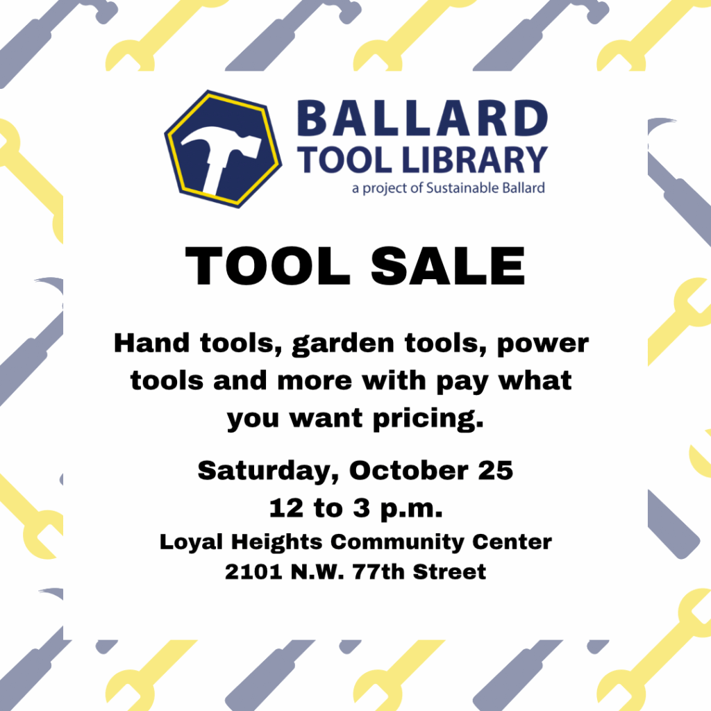 Do you have tools your don’t use or simply don’t have the space to store anymore? Consider donating them for our upcoming Tool Sale on Saturday October. 25th from Noon to 3pm at Loyal Heights Community Center. Need tools? Become a Sustainable Ballard member which includes Tool Library membership. Or come to the sale and shop for good to new condition tools at pay-what-you-want prices. Questions? Please contact Tool Library Manager.